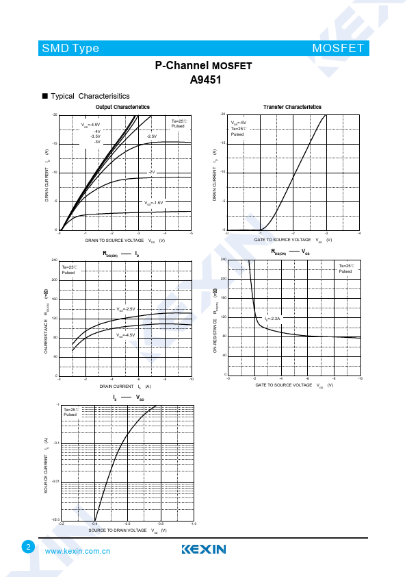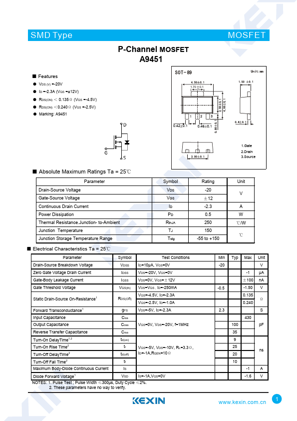 ● VDS (V) =-20V ● ID =-2.3A (VGS =±12V) ● RDS(ON) < 0.135Ω (VGS =-4.5V) ● RDS(ON) <0.240Ω (VGS =-2.5V) ● Marking: A9451