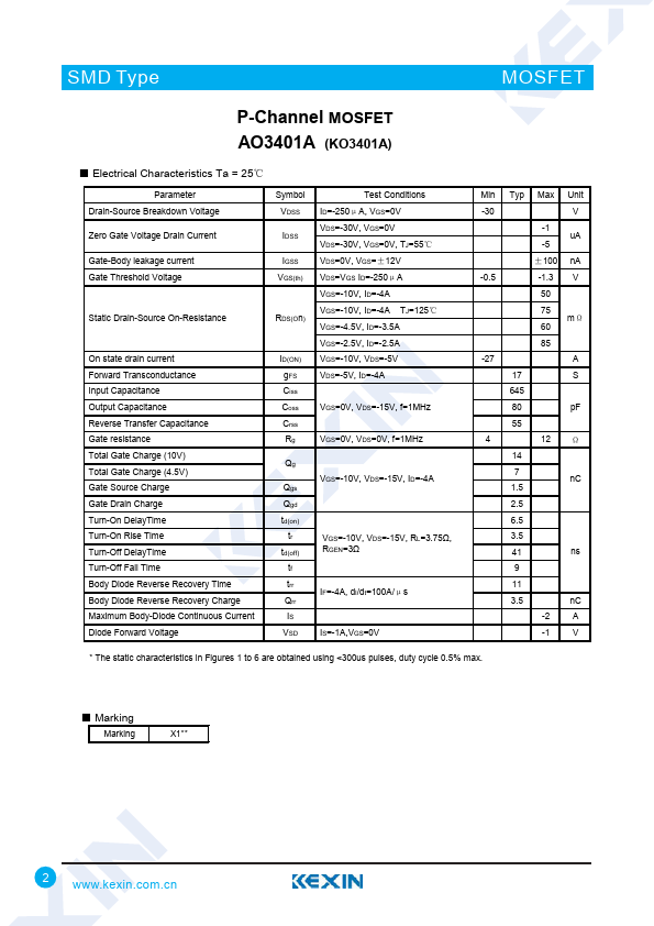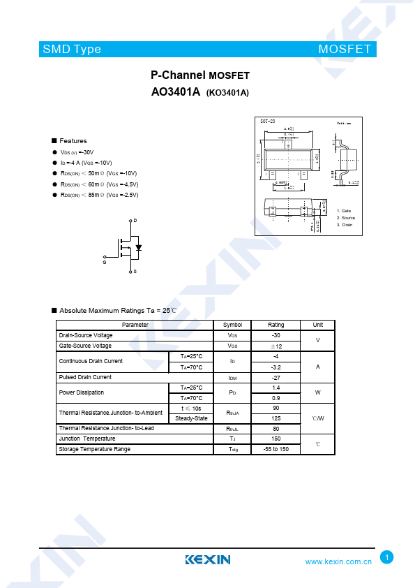 ● VDS (V) =-30V ● ID =-4 A (VGS =-10V) ● RDS(ON) < 50mΩ (VGS =-10V) ● RDS(ON) < 60mΩ (VGS =-4.5V) ● RDS(ON) < 85mΩ (VGS =-2.5V)