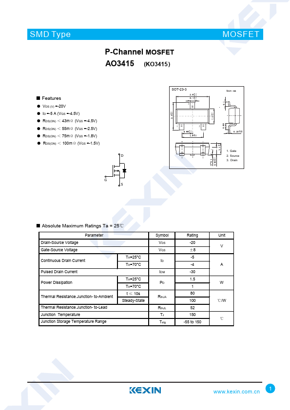 ● VDS (V) =-20V ● ID =-5 A (VGS =-4.5V) ● RDS(ON) < 43mΩ (VGS =-4.5V) ● RDS(ON) < 55mΩ (VGS =-2.5V) ● RDS(ON) < 75mΩ (VGS =-1.8V) ● RDS(ON) < 100mΩ (VGS =-1.5V)