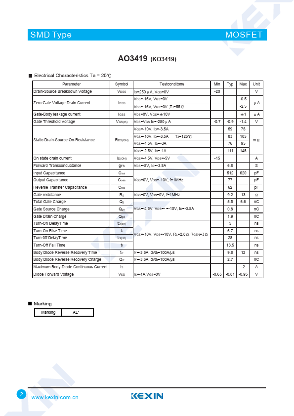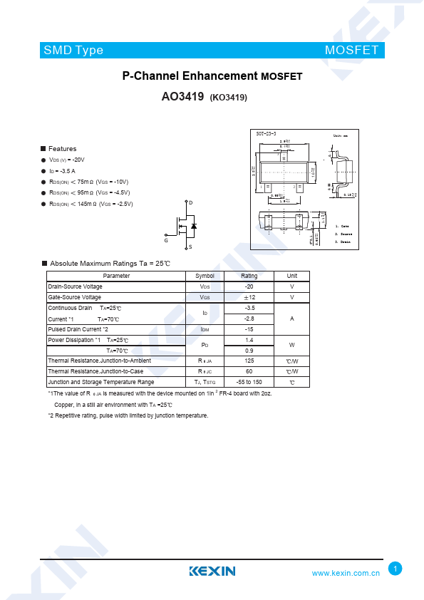P-Channel Enhancement MOSFET AO3419 (KO3419)