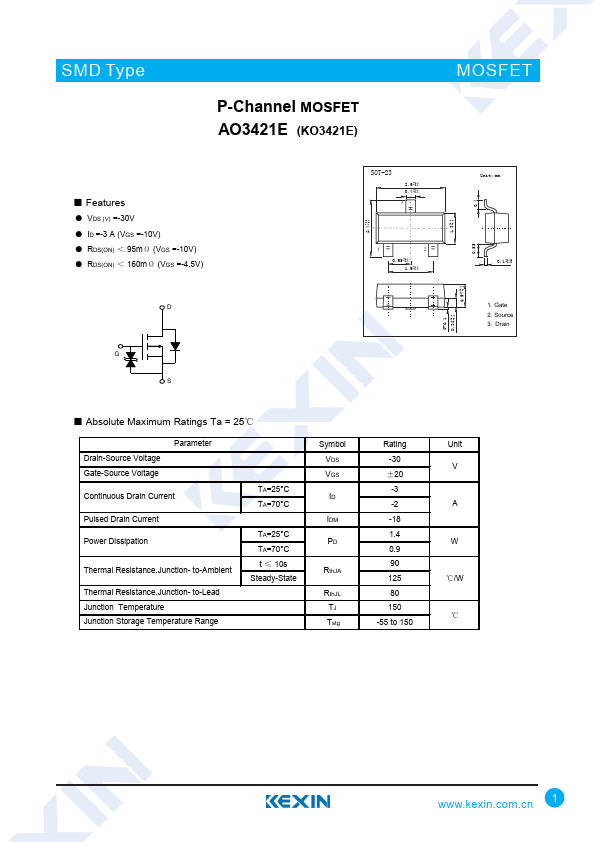 P-Channel MOSFET AO3421E (KO3421E)
