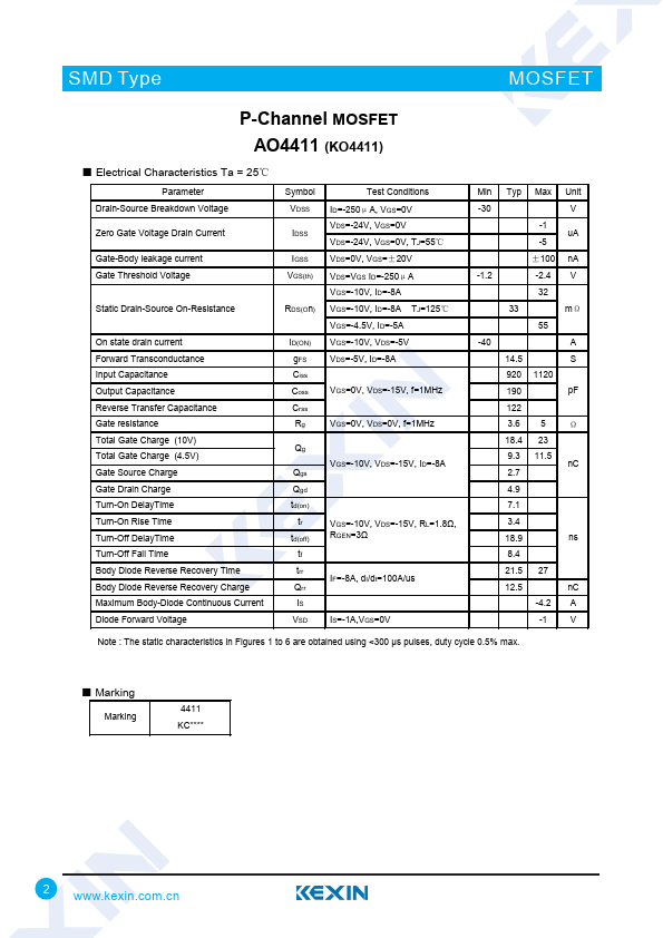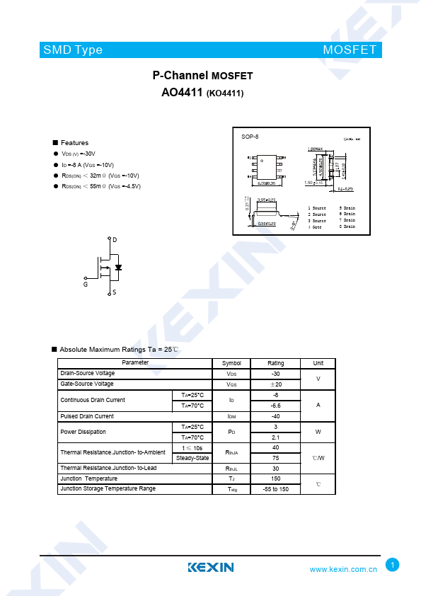 ● VDS (V) =-30V ● ID =-8 A (VGS =-10V) ● RDS(ON) < 32mΩ (VGS =-10V) ● RDS(ON) < 55mΩ (VGS =-4.5V)