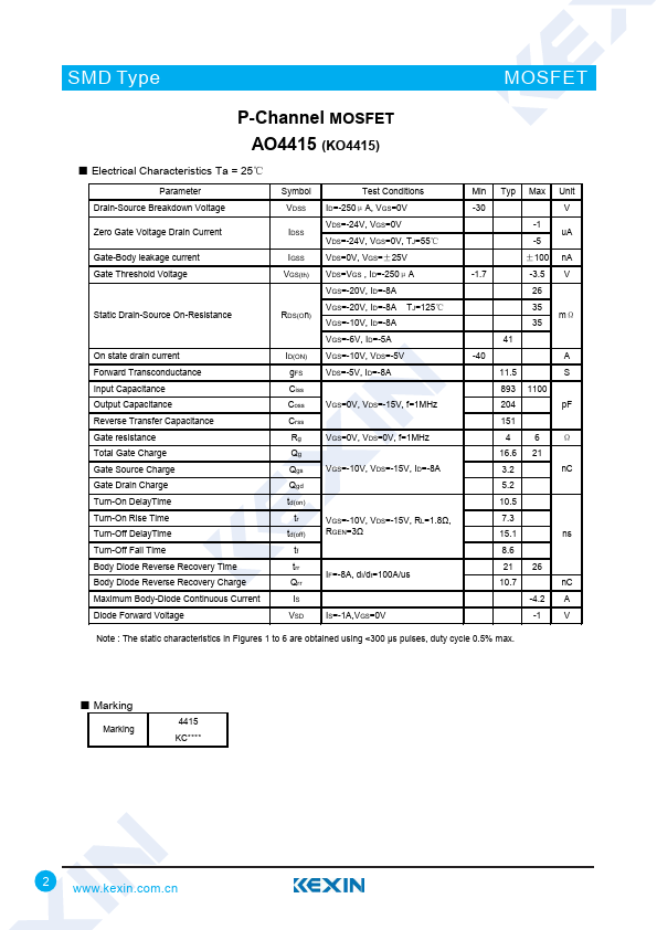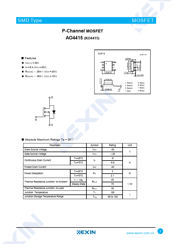 ● VDS (V) =-30V ● ID =-8 A (VGS =-20V) ● RDS(ON) < 26mΩ (VGS =-20V) ● RDS(ON) < 35mΩ (VGS =-10V)