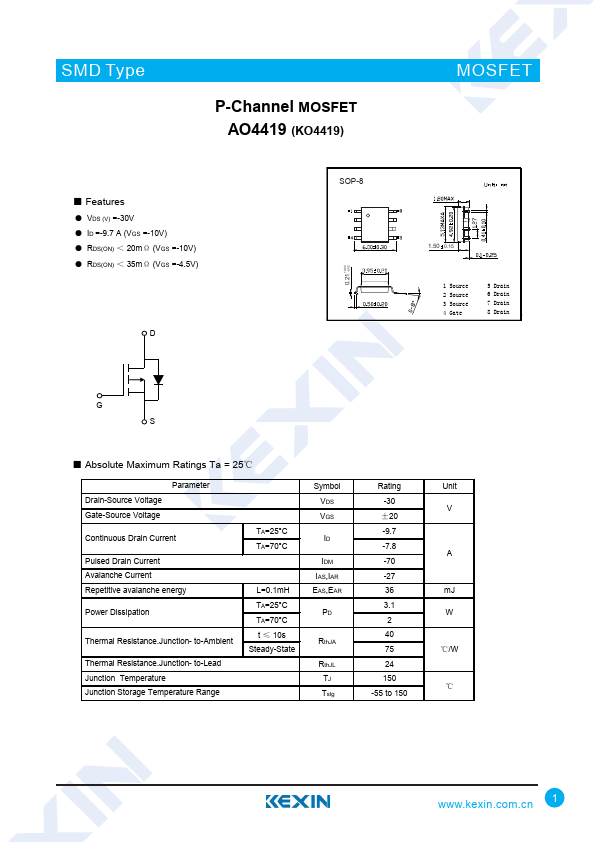 ● VDS (V) =-30V ● ID =-9.7 A (VGS =-10V) ● RDS(ON) < 20mΩ (VGS =-10V) ● RDS(ON) < 35mΩ (VGS =-4.5V)