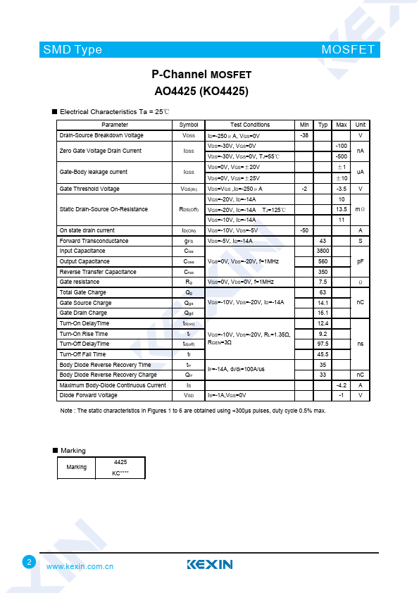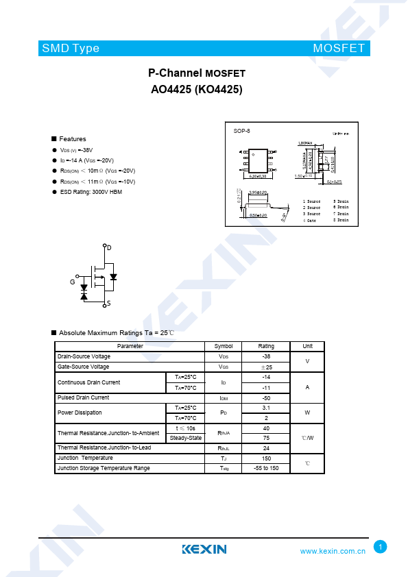 ● VDS (V) =-38V ● ID =-14 A (VGS =-20V) ● RDS(ON) < 10mΩ (VGS =-20V) ● RDS(ON) < 11mΩ (VGS =-10V) ● ESD Rating: 3000V HBM