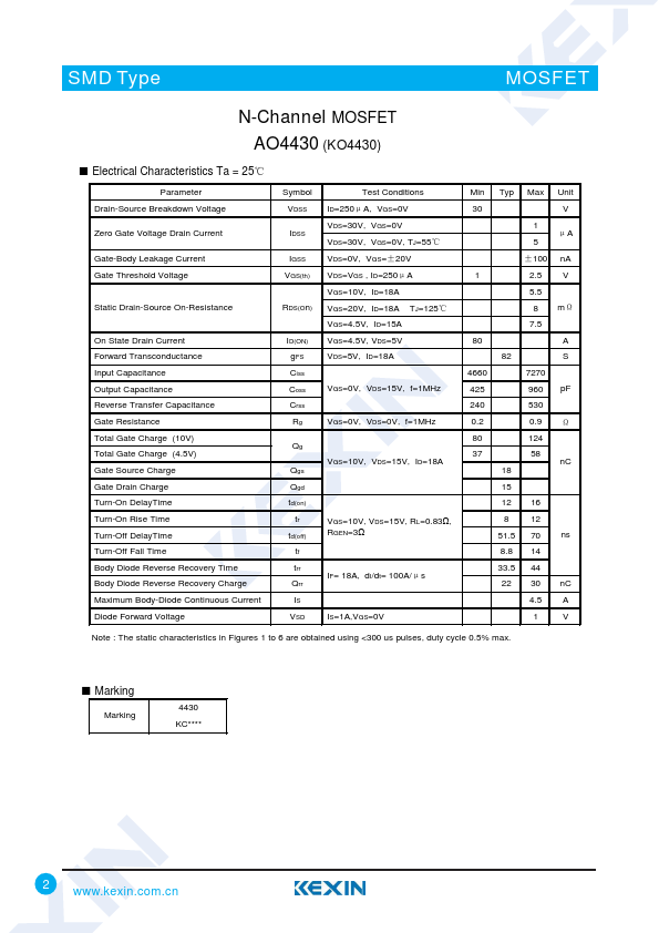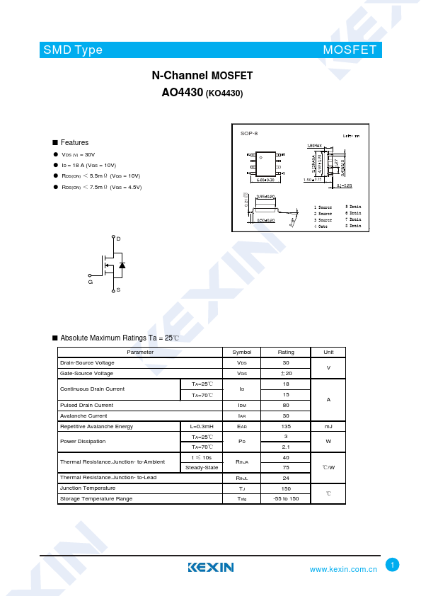 ● VDS (V) = 30V ● ID = 18 A (VGS = 10V) ● RDS(ON) < 5.5mΩ (VGS = 10V) ● RDS(ON) < 7.5mΩ (VGS = 4.5V)