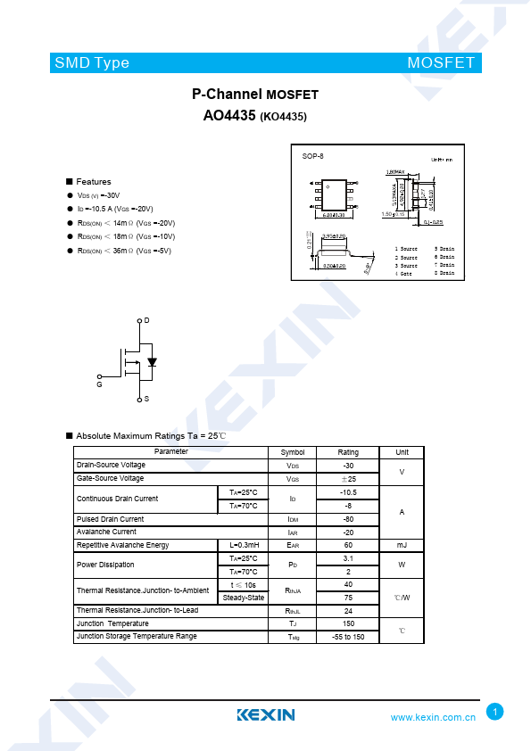 ● VDS (V) =-30V ● ID =-10.5 A (VGS =-20V) ● RDS(ON) < 14mΩ (VGS =-20V) ● RDS(ON) < 18mΩ (VGS =-10V) ● RDS(ON) < 36mΩ (VGS =-5V)