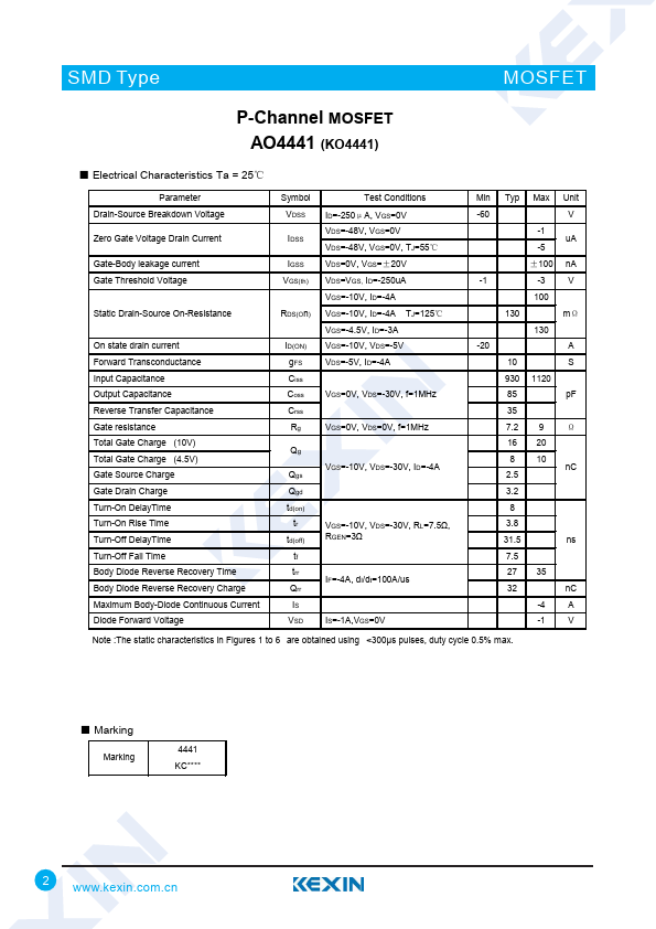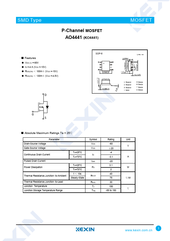 ● VDS (V) =-60V ● ID =-4 A (VGS =-10V) ● RDS(ON) < 100mΩ (VGS =-10V) ● RDS(ON) < 130mΩ (VGS =-4.5V)