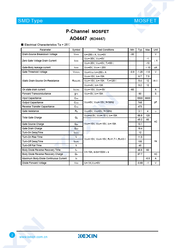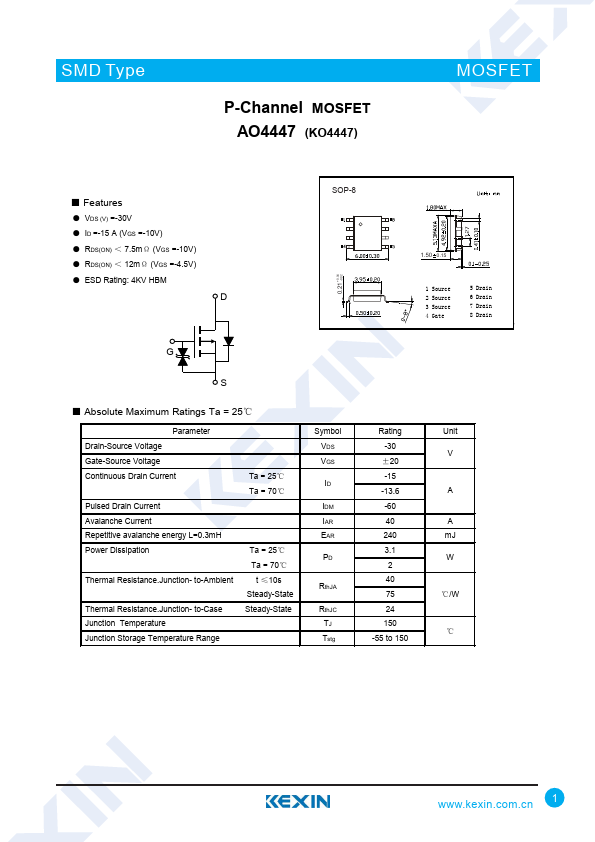 ● VDS (V) =-30V ● ID =-15 A (VGS =-10V) ● RDS(ON) < 7.5mΩ (VGS =-10V) ● RDS(ON) < 12mΩ (VGS =-4.5V) ● ESD Rating: 4KV HBM