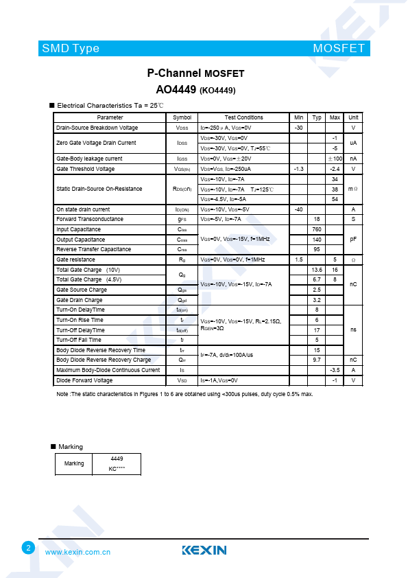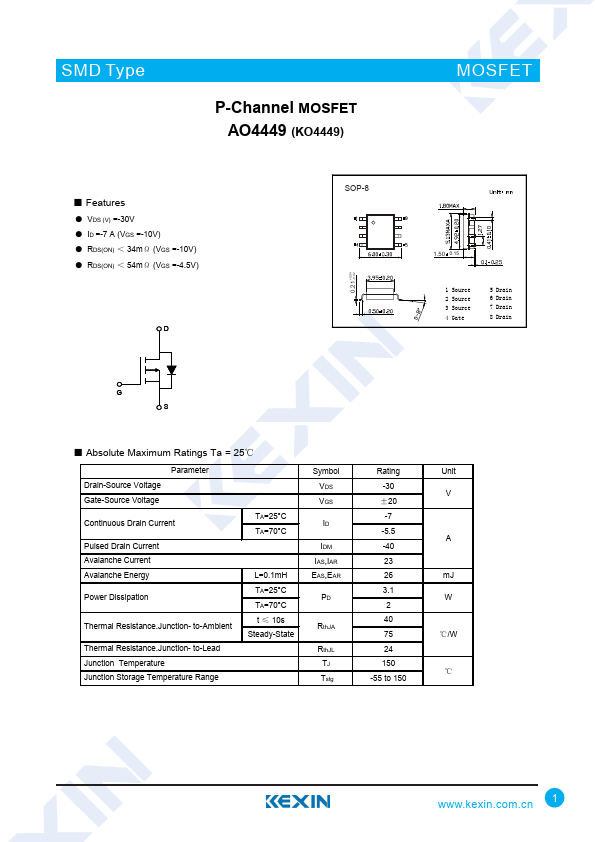 ● VDS (V) =-30V ● ID =-7 A (VGS =-10V) ● RDS(ON) < 34mΩ (VGS =-10V) ● RDS(ON) < 54mΩ (VGS =-4.5V)