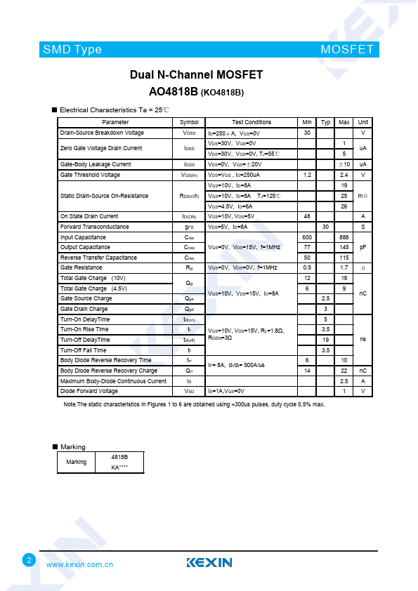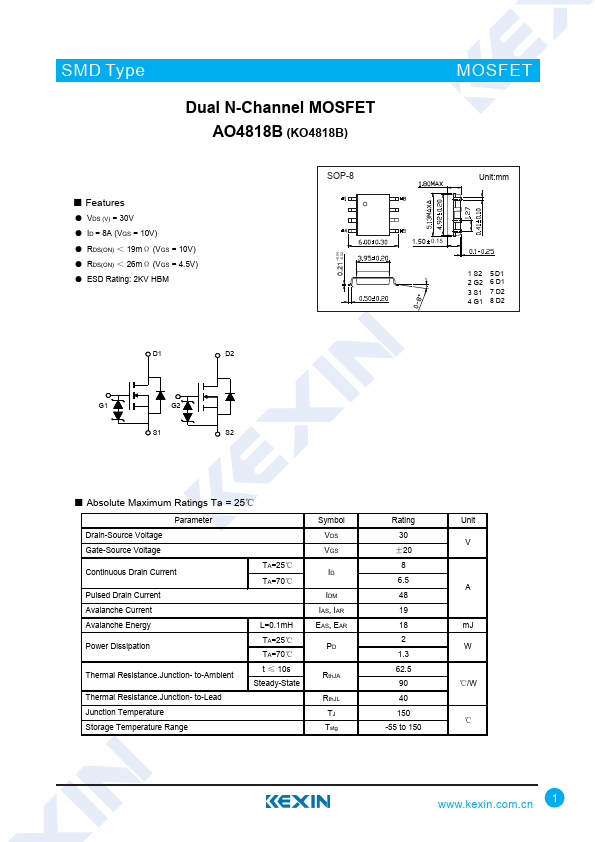 Dual N-Channel MOSFET AO4818B (KO4818B)
