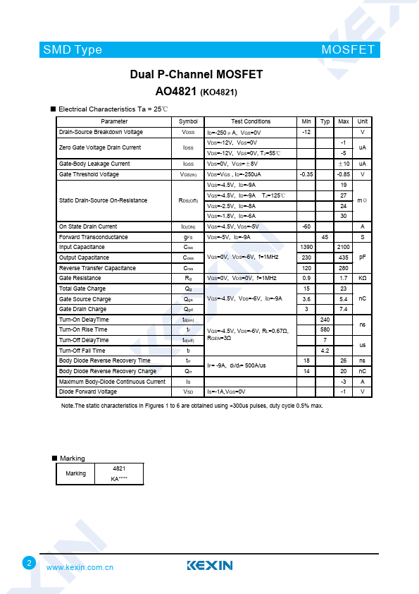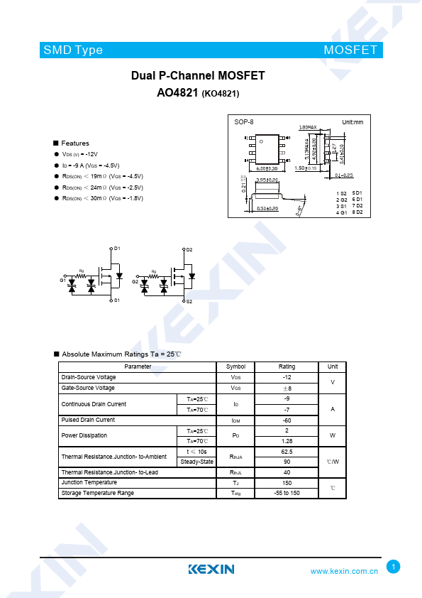 | AO4821 | Dual P-Channel MOSFET | Alpha & Omega Semiconductors |
