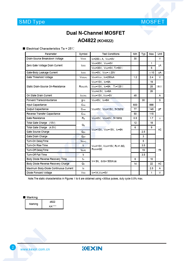 Dual N-Channel MOSFET AO4822 (KO4822)