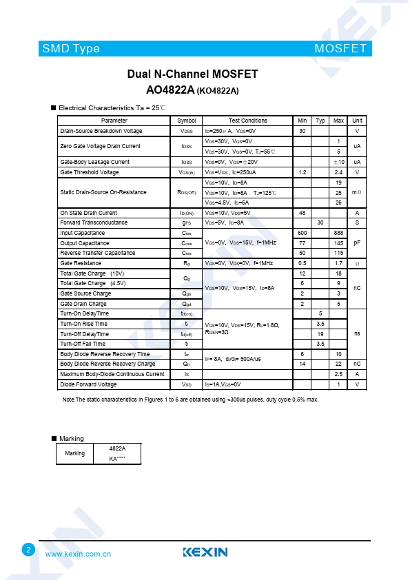 Dual N-Channel MOSFET AO4822A (KO4822A)