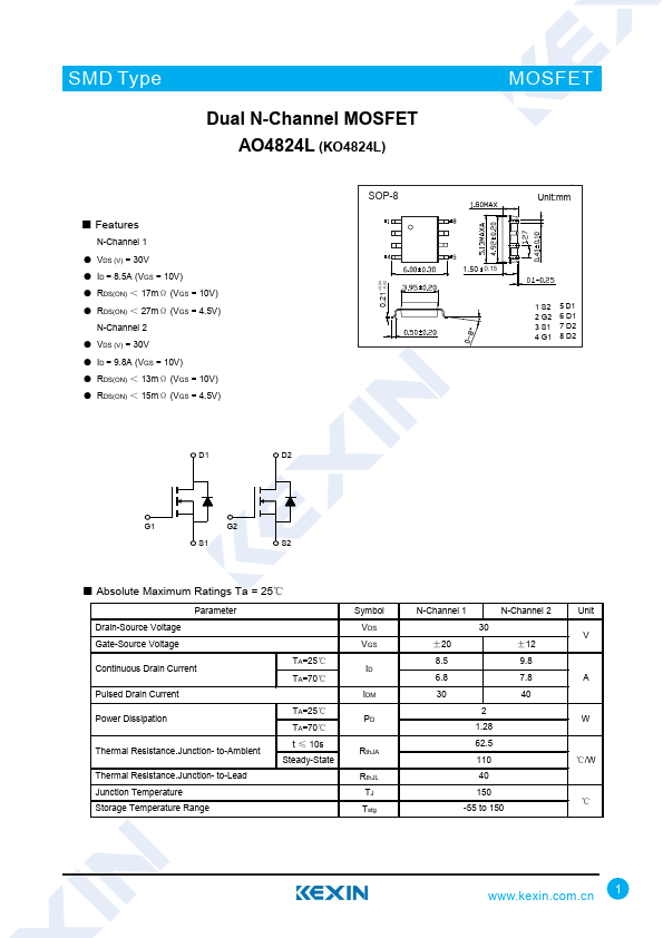 | AO4824L | 30V Dual N-Channel MOSFET | Alpha & Omega Semiconductors |