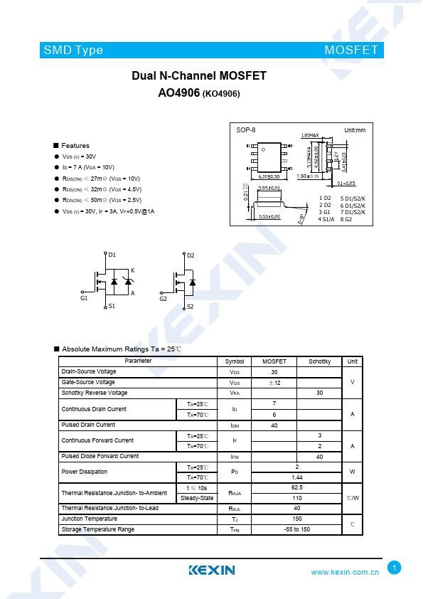 | AO4906 | Dual N-Channel Enhancement Mode Field Effect Transistor | Alpha & Omega Semiconductors |