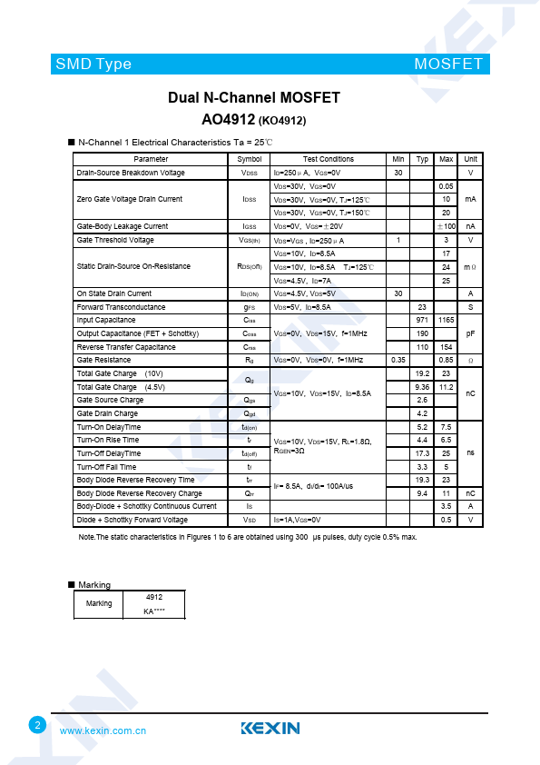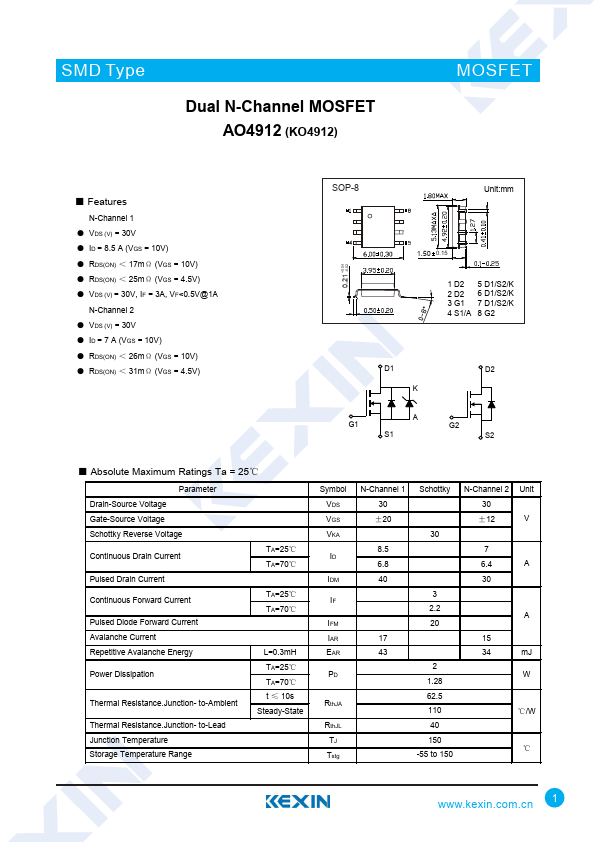 | AO4912 | Dual N-Channel Enhancement Mode Field Effect Transistor | Alpha & Omega Semiconductors |