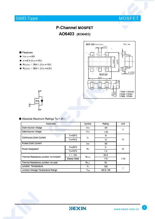 ● VDS (V) =-30V ● ID =-6 A (VGS =-10V) ● RDS(ON) < 35mΩ (VGS =-10V) ● RDS(ON) < 58mΩ (VGS =-4.5V)