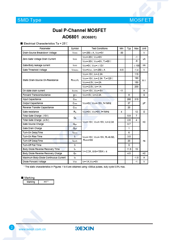 Dual P-Channel MOSFET AO6801 (KO6801)