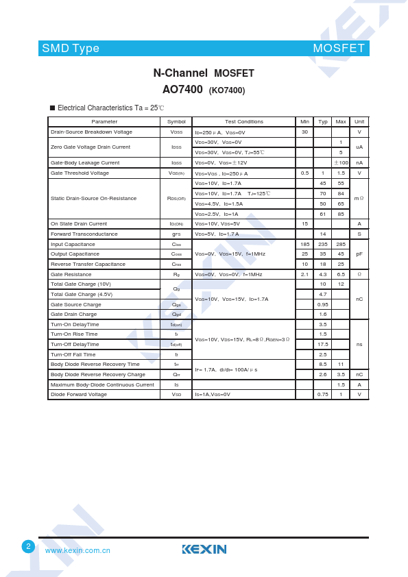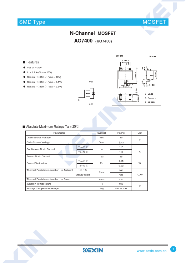 ƽ VDS (V) = 30V ƽ ID = 1.7 A (VGS = 10V) ƽ RDS(ON) ˘ 55m¡ (VGS = 10V) ƽ RDS(ON) ˘ 65m¡ (VGS = 4.5V) ƽ RDS(ON) ˘ 85m¡ (VGS = 2.5V)