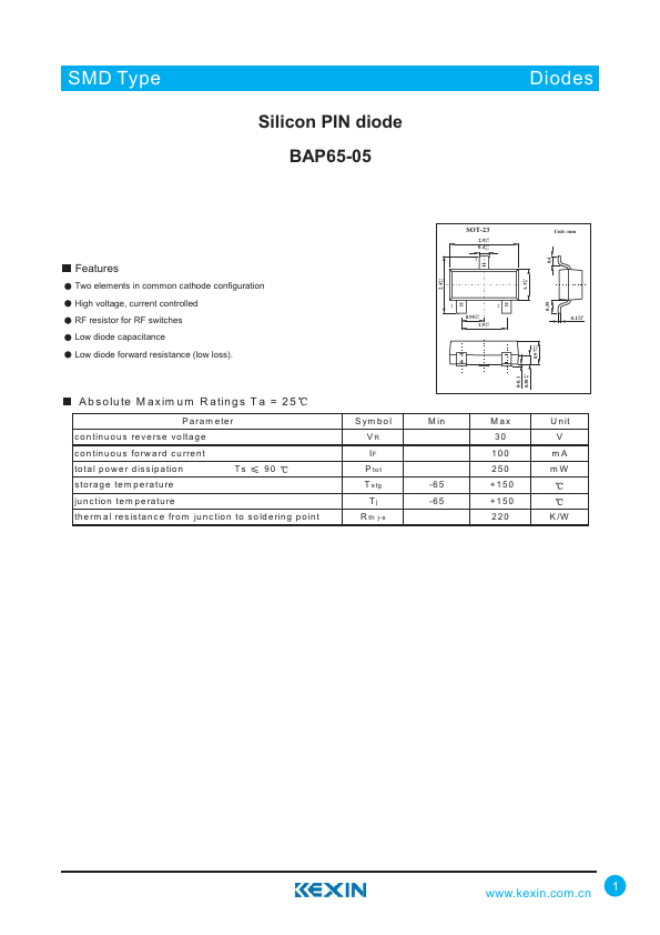 SMD Type Silicon PIN diode BAP65-05 Diodes.