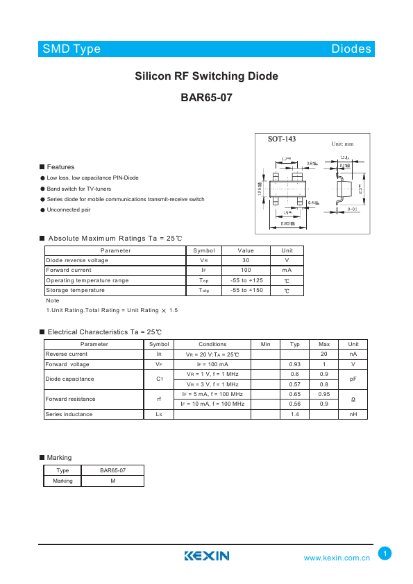 | BAR65-07 | Silicon RF Switching Diode | Siemens Semiconductor Group | |
