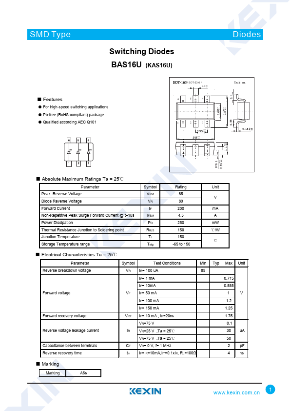SMD Type Switching Diodes BAS16U (KAS16U).