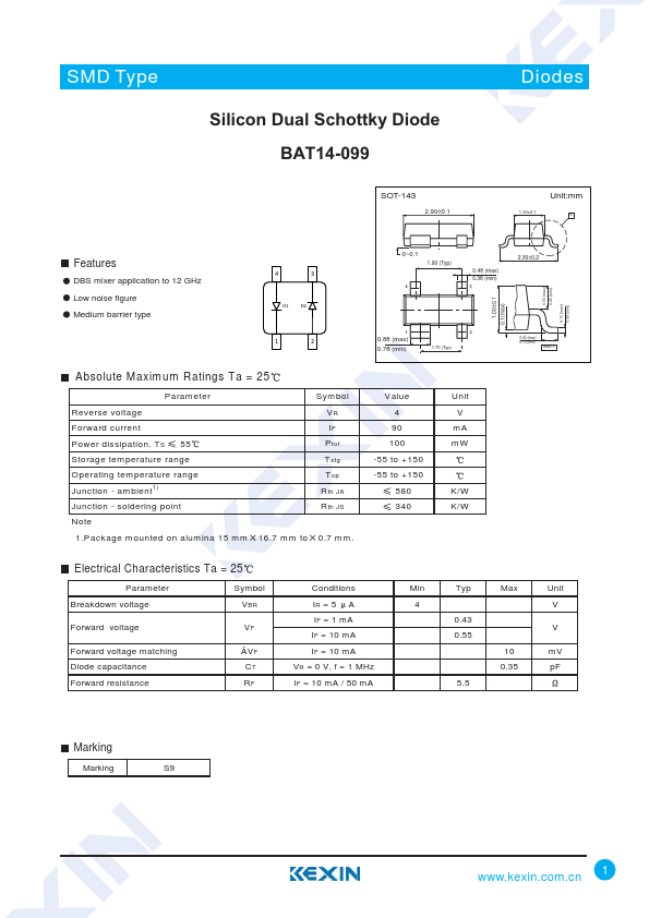 Overview: SMD Type Silicon Dual Schottky Diode BAT14-099 SOT-143 2.90±0.1 Diodes 1.30±0.1 Unit:mm X 1.00±0.1 0.1(max) 0.55 (max) 0.45 (min) 0.15 (max) 0.
