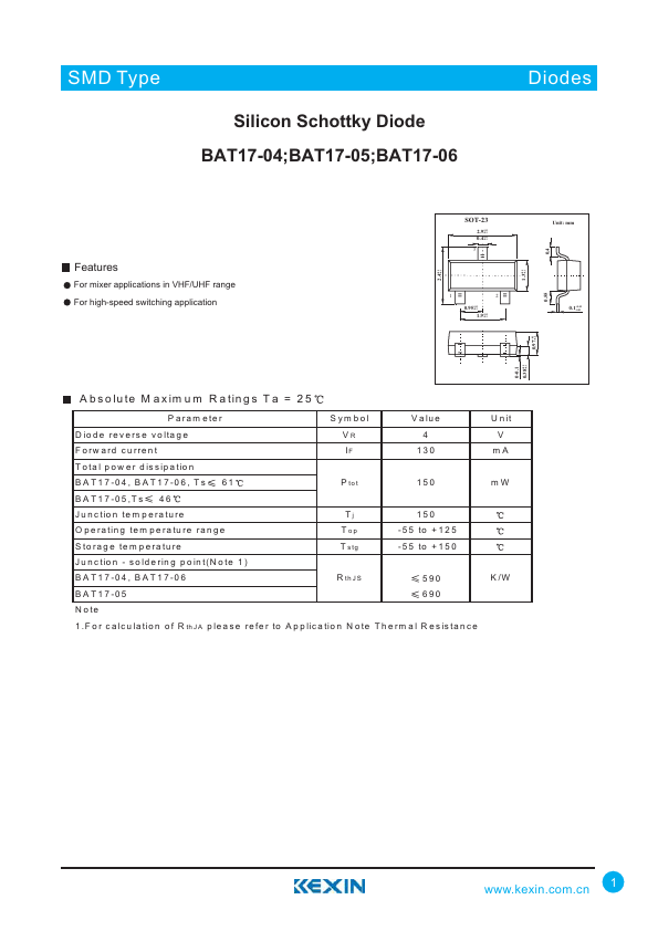 Overview: SMD Type Silicon Schottky Diode BAT17-04;BAT17-05;BAT17-06 Diodes.