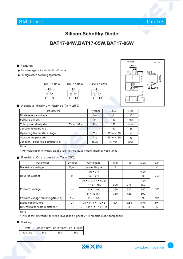 Overview: SMD Type Silicon Schottky Diode BAT17-04W,BAT17-05W,BAT17-06W.