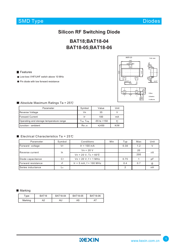 | BAT18 | Silicon RF Switching Diode | Siemens Semiconductor Group | |