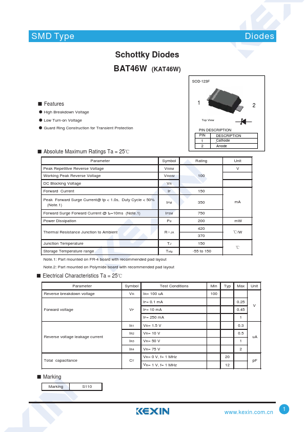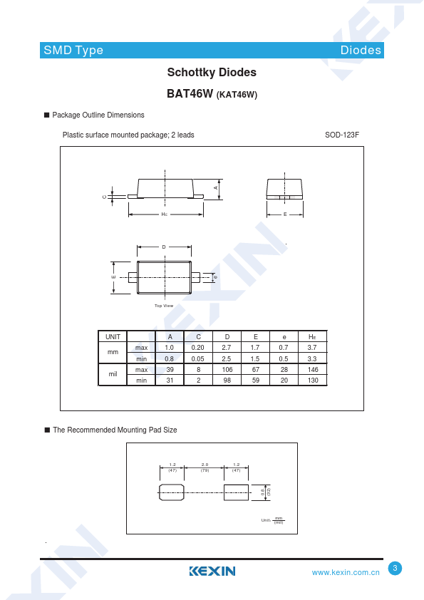 Overview: SMD Type Schottky Diodes BAT46W (KAT46W) SOD-123F Diodes Ƶ.