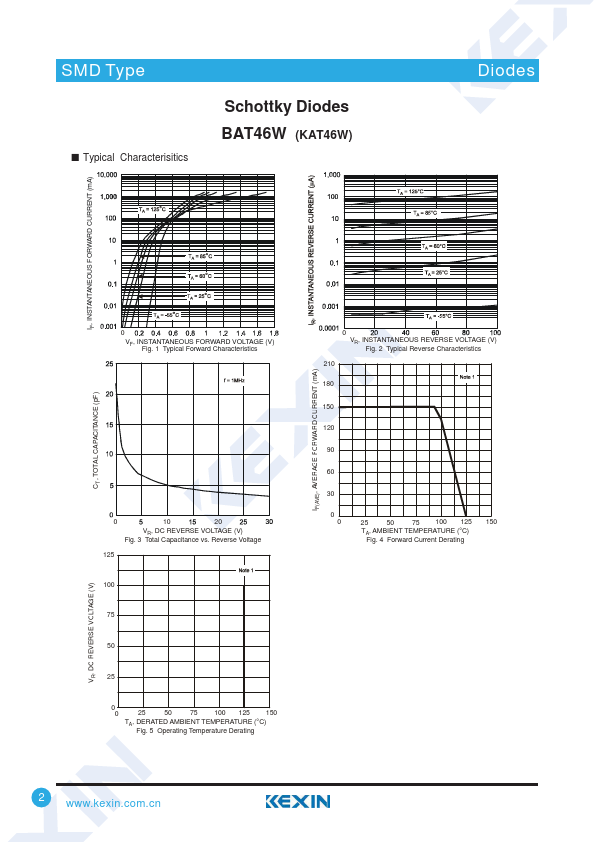 PIN DESCRIPTION 1 Cathode 2 Anode Rating Unit V 100 150 350 750 200 420 370 150 -55 to 150 mA mW ć/W ć Parameter Reverse breakdown voltage Forward voltage Reverse voltage leakage current Total capacitance Symbol Test Conditions VR IR= 100 uA IF= 0.1 mA VF IF= 10 mA IF= 250 mA IR1 VR= 1.5 V IR2 VR= 10 V IR3 VR= 50 V IR4 VR= 75 V VR= 0 V, f= 1 MHz CT VR= 1 V, f= 1 MHz Min Typ Max Unit 100 0.25 V 0.45 1 0.3 0.5 uA 1 2 20 pF 12 Ƶ Marking Marking S110 .kexin..cn 1 SMD Type Ƶ Typical Characterisitics Schottky Diodes BAT46W (KAT46W) Diodes IF, INSTANTANEOUS FORWARD CURRENT (mA) CT, TOTAL CAPACITANCE (pF) 0 VF, INSTANTANEOUS FORWARD VOLTAGE Fig.