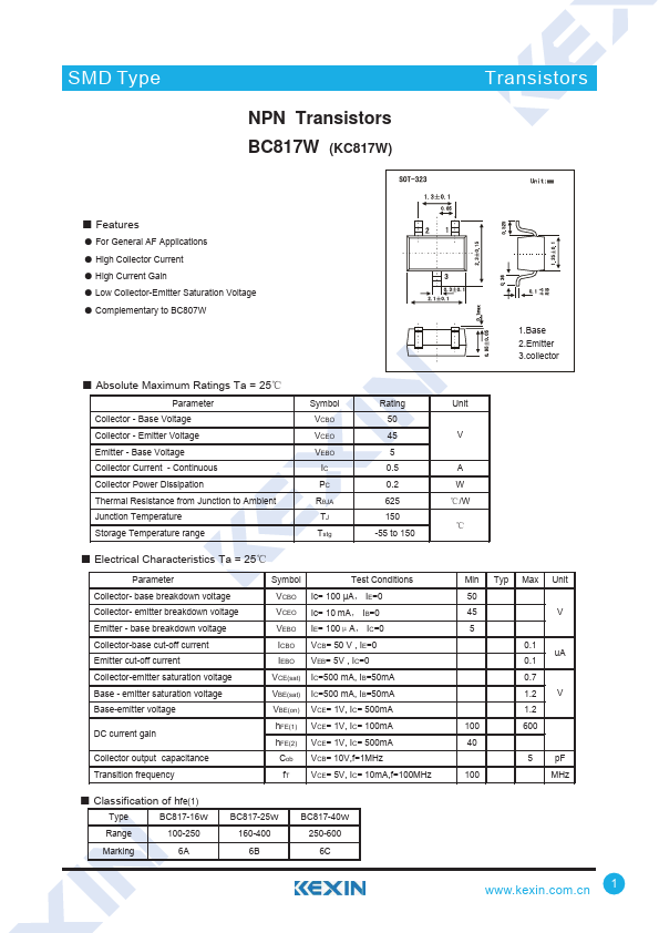 SMD Type NPN Transistors BC817W (KC817W) Transistors Ƶ.