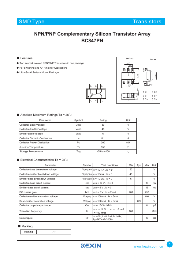 Overview: SMD Type Transistors NPN/PNP plementary Silicon Transistor Array BC847PN.