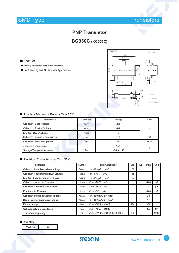 BC856C | PNP Silicon Epitaxial Transistors | Kingtronics |