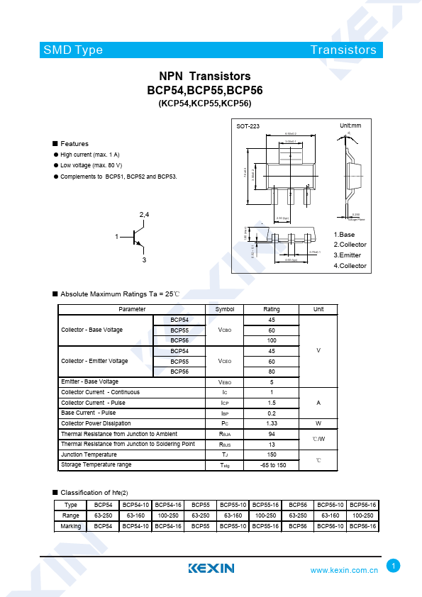SMD Type Transistors NPN Transistors BCP54,BCP55,BCP56 (KCP54,KCP55,KCP56).