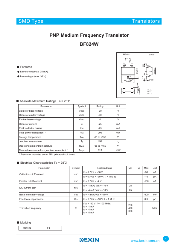 Overview: SMD Type TransistIoCrs PNP Medium Frequency Transistor BF824W.