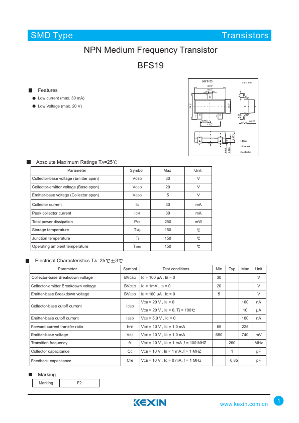 Overview: SMD Type Transistors NPN Medium Frequency Transistor BFS19.
