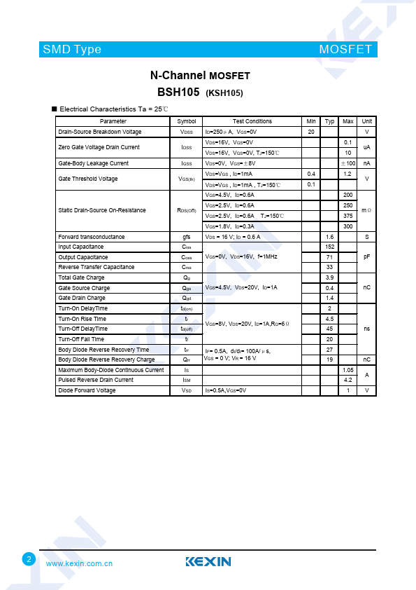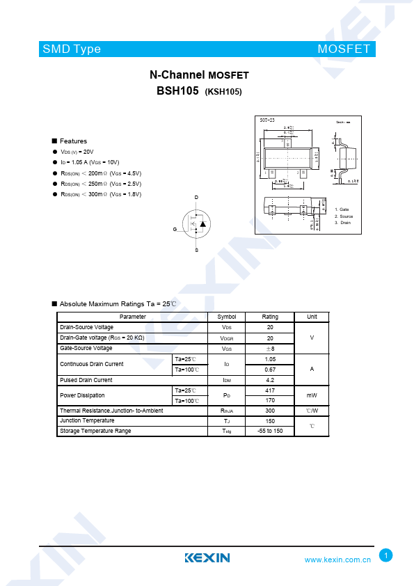 ● VDS (V) = 20V ● ID = 1.05 A (VGS = 10V) ● RDS(ON) < 200mΩ (VGS = 4.5V) ● RDS(ON) < 250mΩ (VGS = 2.5V) ● RDS(ON) < 300mΩ (VGS = 1.8V)