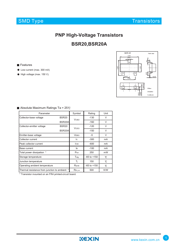 Overview: SMD Type Transistors PNP High-Voltage Transistors BSR20,BSR20A.