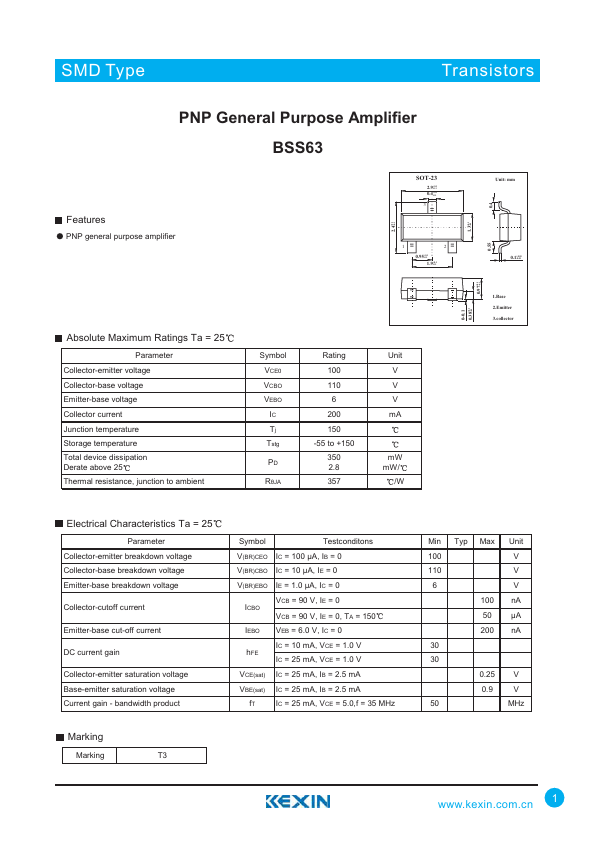 Overview: SMD Type Transistors PNP General Purpose Amplifier BSS63.
