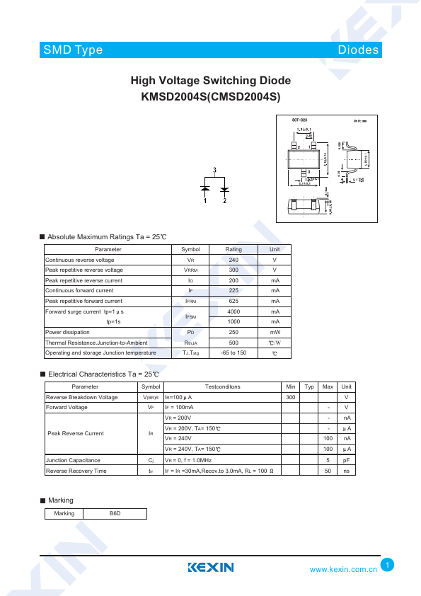 SMD Type High Voltage Switching Diode KMSD2004S(CMSD2004S) Diodes Ratings Ta = 25 Parameter Continuous reverse voltage Peak repetitive reverse voltage Peak repetitive reverse current Continuous forward current Peak repetitive forward current Forward surge.