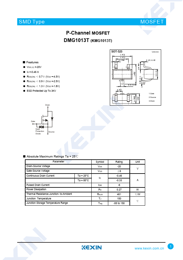 ● VDS (V) =-20V ● ID =-0.46 A ● RDS(ON) < 0.7Ω (VGS =-4.5V) ● RDS(ON) < 0.9Ω (VGS =-2.5V) ● RDS(ON) < 1.3Ω (VGS =-1.8V) ● ESD Protected Up To 3KV