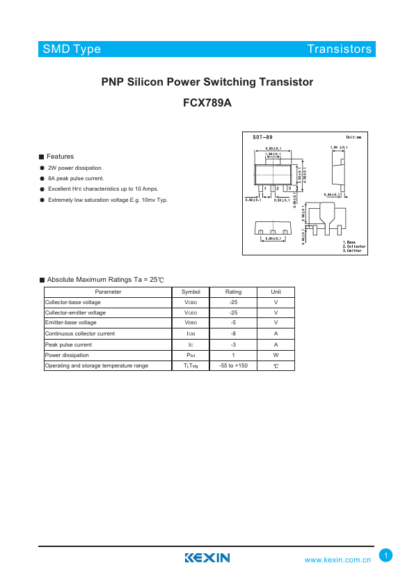 • 2W power dissipation. 8A peak pulse current. Excellent HFE characteristics up to 10 Amps. Extremely low saturation voltage E. g. 10mv Typ. Absolute Maximum Ratings Ta = 25 Parameter Collector-base voltage Collector-emitter voltage Emitter-base voltage Continuous collector current Peak pulse current Power dissipation Operating and storage temperature range Symbol Rating Unit VCBO -25 V VCEO -25 V VEBO -5 V ICM -8 A IC -3 A Ptot 1 W Tj,Tstg -55 to +150 www. kexin. com. cn 1.