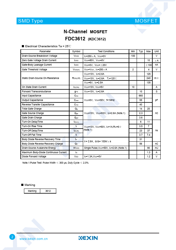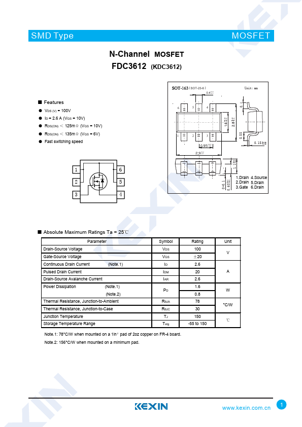 ● VDS (V) = 100V ● ID = 2.6 A (VGS = 10V) ● RDS(ON) < 125mΩ (VGS = 10V) ● RDS(ON) < 135mΩ (VGS = 6V) ● Fast switching speed
