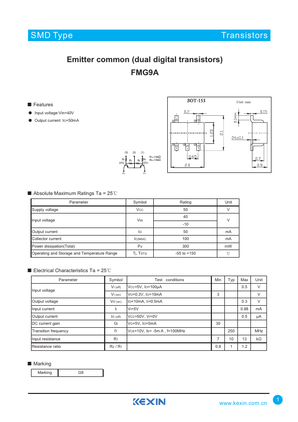 Overview: SMD Type TransistIoCrs Emitter common (dual digital transistors) FMG9A.