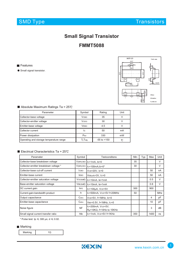 • Small signal transistor. +0.1 2.4 -0.1 SOT-23 2.9+0.1 -0.1 0.4+0.1 -0.1 3 1 2 0.95+0.1 -0.1 1.9+0.1 -0.1 Absolute Maximum Ratings Ta = 25 Parameter Collector-base voltage Collector-emitter voltage Emitter-base voltage Collector current Power dissipation Operating and storage temperature range Symbol Rating Unit VCBO 35 V VCEO 30 V VEBO 4.5 V IC 50 mA Ptot 330 mW Tj,Tstg -55 to +150 0-0.1 +0.1 0.38 -0.1 +0.1 1.3 -0.1 +0.1 0.97 -0.1 0.55 0.4 Unit: mm 0.1+0.05 -0.01.