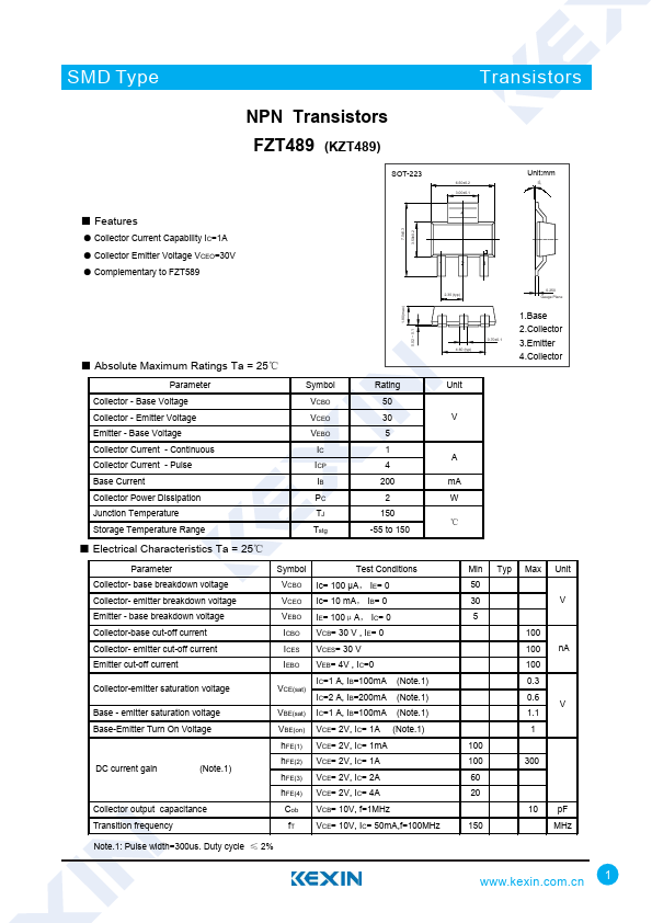 Overview: SMD Type Transistors NPN Transistors FZT489 (KZT489) SOT-223 6.50±0.2 3.00±0.