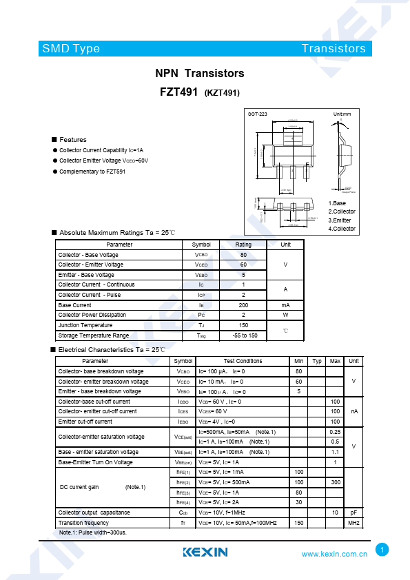 Overview: SMD Type Transistors NPN Transistors FZT491 (KZT491) ■.